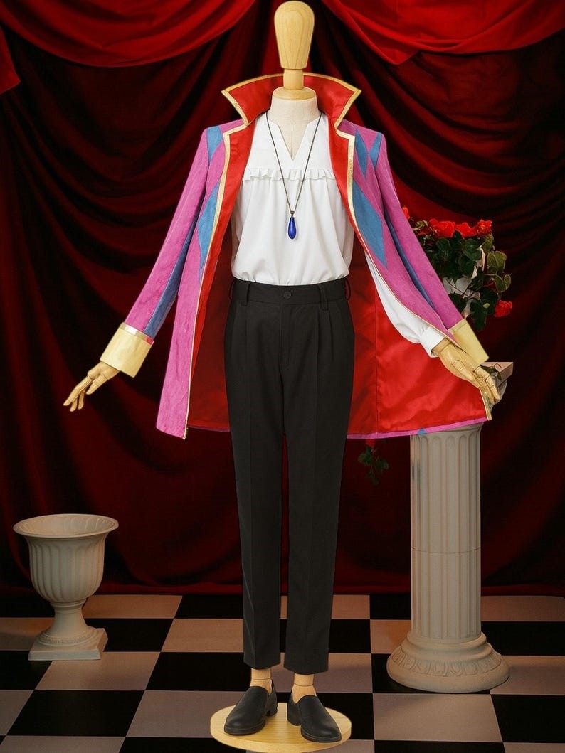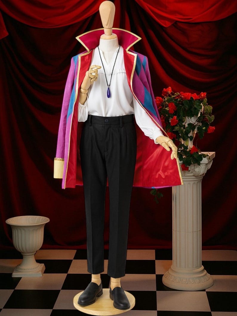 This elegant fantasy cosplay costume features a vibrant multi-color tailcoat, crisp white shirt with necklace, and sleek black trousers. Its whimsical and magical design is ideal for Halloween parties, cosplay conventions, stage performances, or themed photoshoots. Perfect for fans of enchanting fantasy worlds who want to bring charm and charisma to life.