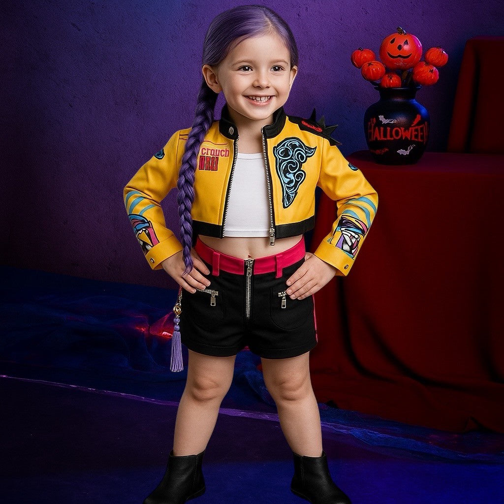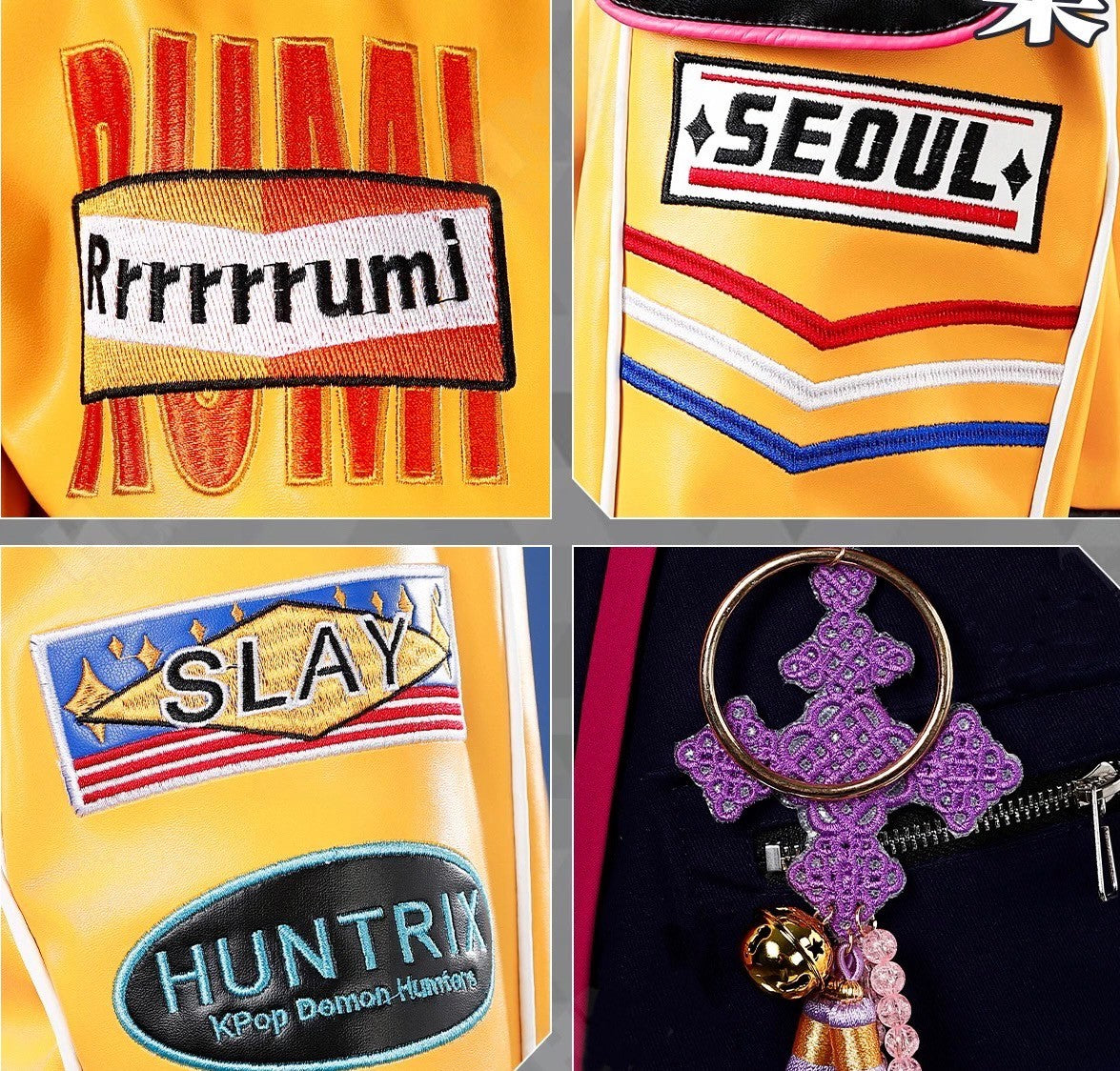 Step into character as Rumi from Kpop Demon Hunter with this striking cosplay costume. Featuring a vibrant yellow jacket with bold printed details, cropped inner top, and black shorts with zipper and charm accessories, this outfit perfectly captures Rumi’s edgy and colorful stage look. Ideal for Halloween parties, cosplay conventions, K-pop events, or themed photoshoots.