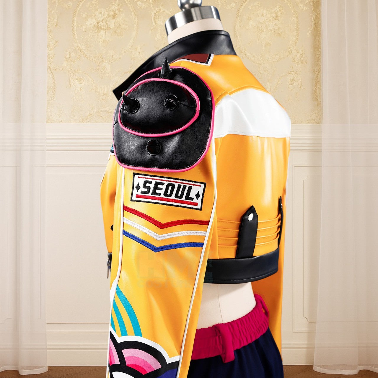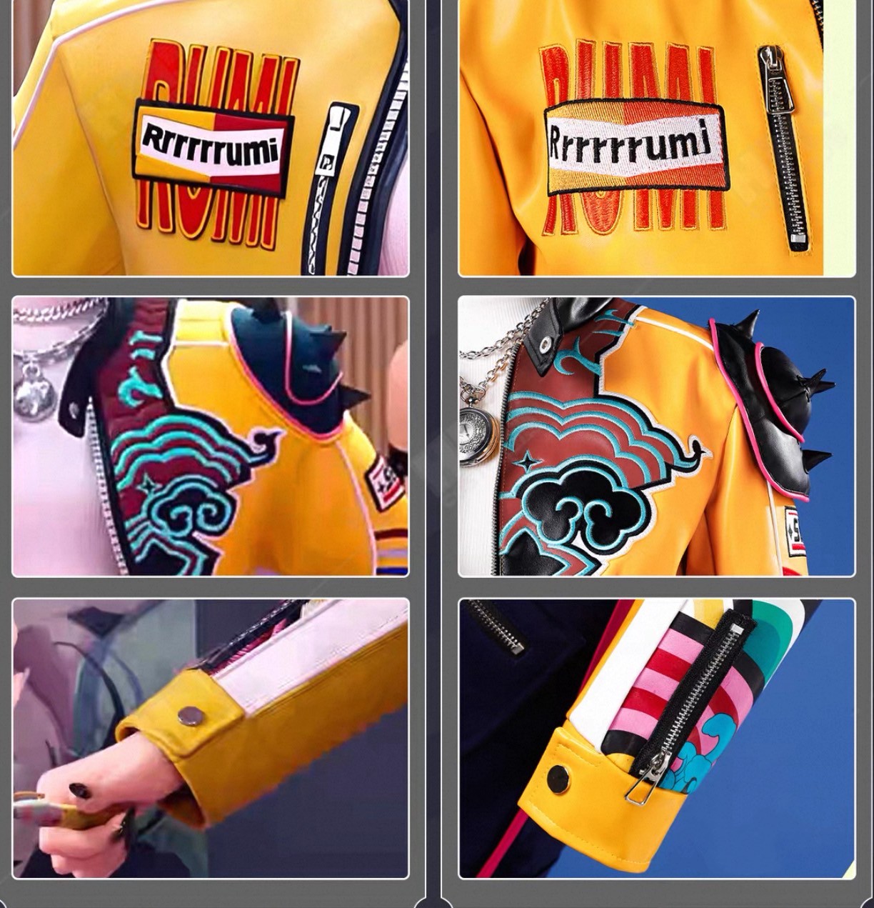Step into character as Rumi from Kpop Demon Hunter with this striking cosplay costume. Featuring a vibrant yellow jacket with bold printed details, cropped inner top, and black shorts with zipper and charm accessories, this outfit perfectly captures Rumi’s edgy and colorful stage look. Ideal for Halloween parties, cosplay conventions, K-pop events, or themed photoshoots.