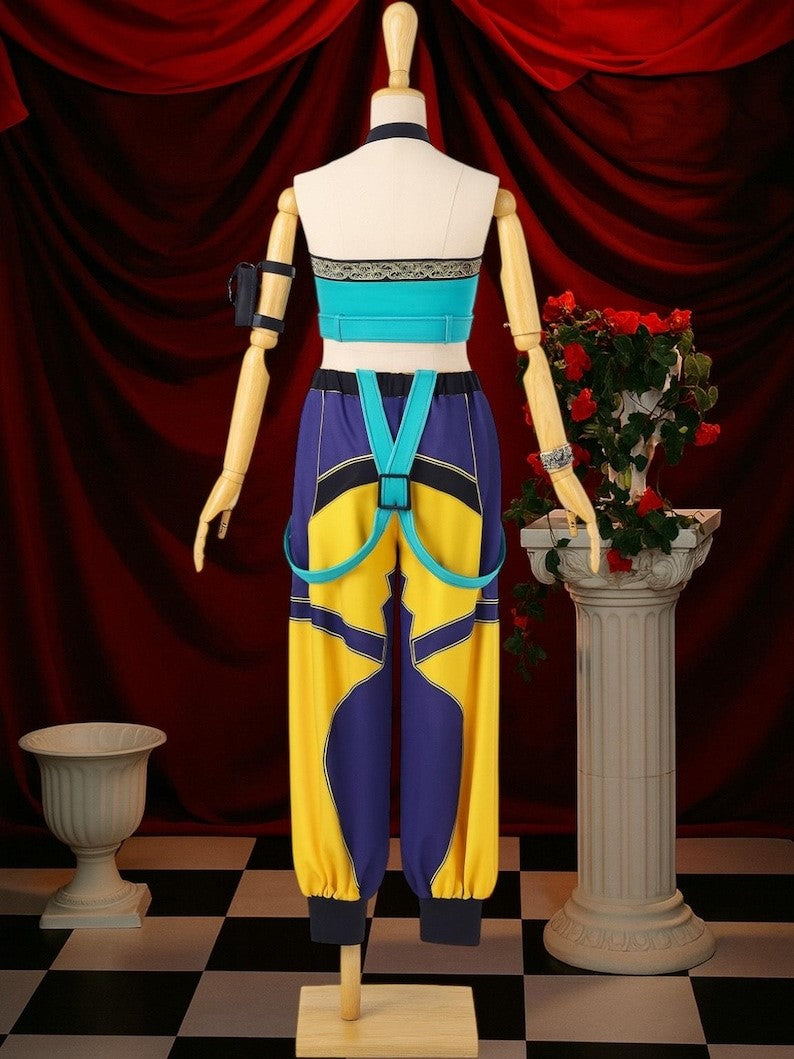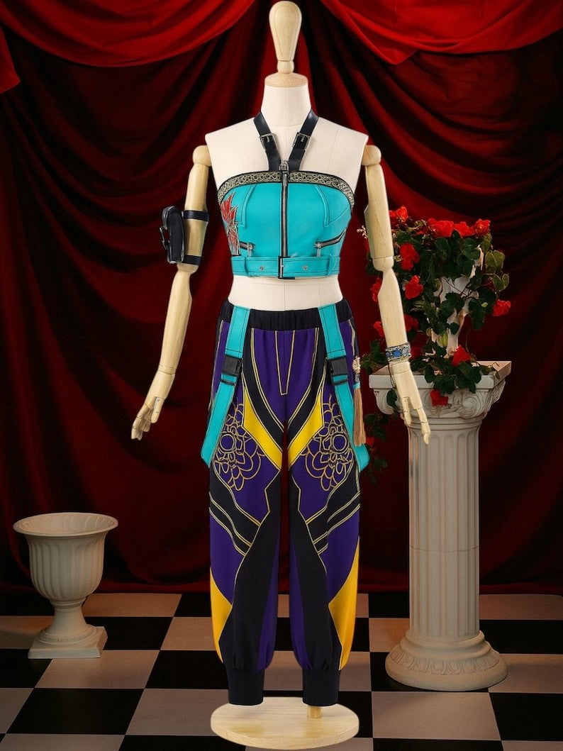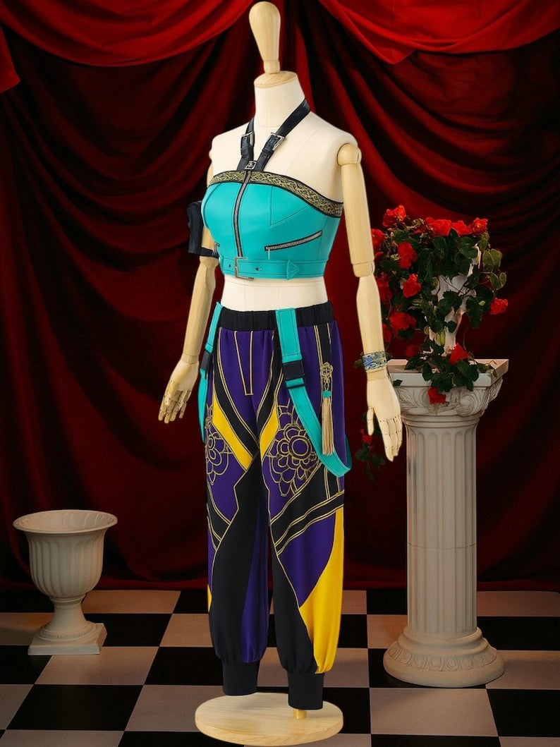 This stylish fantasy cosplay costume features a cropped teal top with zipper design, detailed patterned pants in bold purple and yellow, and matching accessories. Its vibrant and modern style makes it a perfect choice for Halloween parties, cosplay conventions, or themed photoshoots. Ideal for fans of powerful female characters with a unique and striking look.